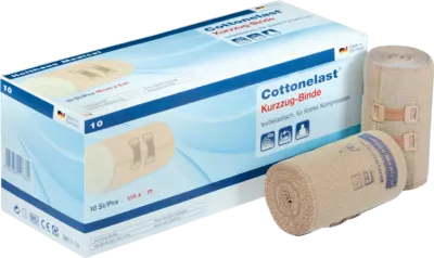 Elastische Kompressionsbinde mit kurzer Dehnung. Zur Behandlung von venösen Erkrankungen.Aus 100% Baumwolle, mit Verbandklammern.5 m gedehnt, Hautfarben.