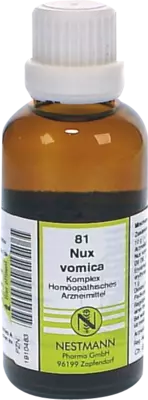 Nux Vomica Komplex Nr. 81Anwendungsgebiete: Registriertes homöopathisches Arzneimittel, daher ohne Angabe einer therapeutischen Indikation. Hinweis: Bei während der Anwendung des Arzneimittels fortdauernden Krankheitssymptomen ist medizinischer Rat einzuholen.