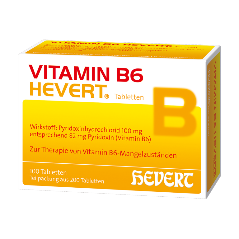 Vitamin B6 Hevert: ein Vitaminpräparat zur Therapie von Vitamin B6-Mangelzuständen (zum Beispiel periphere Neuropathie, Hyperhomocysteinämie). Die Tabletten enthalten 100 mg Pyridoxinhydrochlorid (Vitamin B6). Vitamin B6 ist wichtig für den Aminosäuren- und Eiweißstoffwechsel. Auch ist es u.a. erforderlich für die Bildung von Blutkörperchen, das Nervensystem, seine Überträger- bzw. Botenstoffe und für ein gut funktionierendes und effektives Immunsystem. Erwachsene und Kinder nehmen die Tabletten nur auf Anweisung eines Arztes ein. apothekenpflichtiges Arzneimittel Hevert-Arzneimittel - Naturheilkunde aus der Apotheke (Originalprodukt aus Deutschland) PZN: 02567840