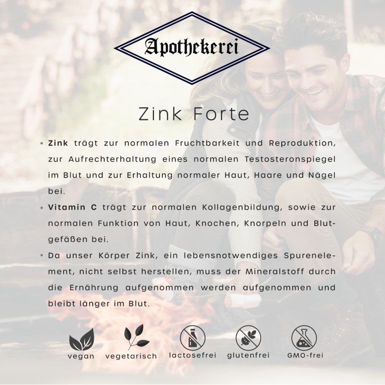 ZINK FORTE - Qualitätsprodukt aus der deutschen Apotheke. Jede Kapsel (514 mg) enthält 30 mg Zink und 160 mg Acerola-Extrakt, davon 34 mg Vitamin C. Natürlich vegan, laktose- und glutenfrei. DAS IMMUNSYSTEM benötigt für die normale Funktion und zum Schutz der Zellen vor oxidativem Stress Zink und Vitamin C. Zudem trägt Vitamin C der normalen Kollagenbildung, sowie der normalen Funktion von Haut, Knochen, Knorpeln und Blutgefäßen bei. VERZEHRSEMPFEHLUNG: jeden zweiten Tag 1 Kapsel eine halbe Stunde vor dem Essen einnehmen. Gesundheitsprodukt aus der Apotheke APOTHEKEREI - originale Qualität aus der deutschen Apotheke. Hergestellt in München nach traditionellen Prinzipien, verpackt in 100 % ökologischem Altpapier. PZN: 08042937